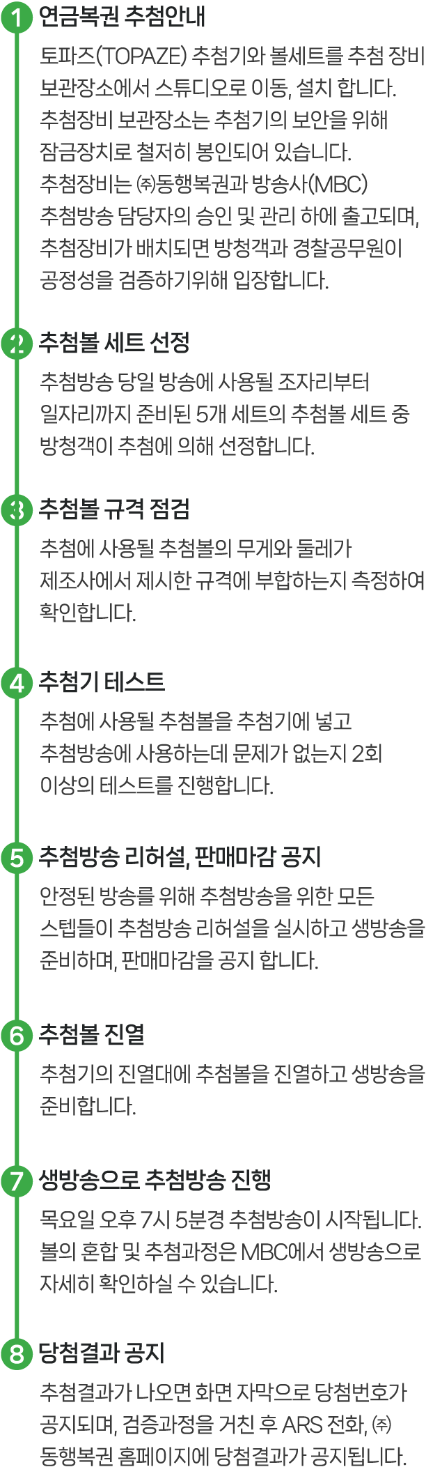 프랑스 AKANIS TECHNOLOGIES사의 TOPAZE 추첨기이며, 추첨기는 다음과 같이 활용 - 메인 추첨기 : 조자리, 십만자리, 만자리, 천자리, 백자리, 십자리, 일자리를 각각 추첨하기 위해 7대를 사용 - 예비용 추첨기 : 방송 중 메인 추첨기에서 장애가 발생된 경우를 대비하여 예비용 추첨기를 설치